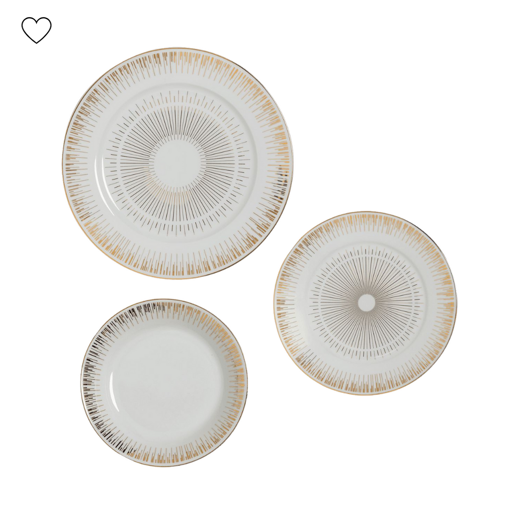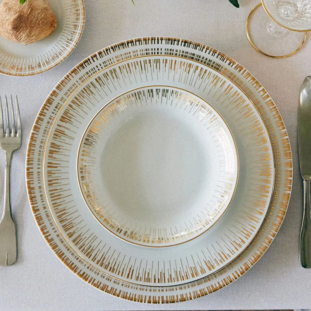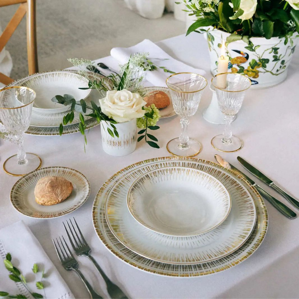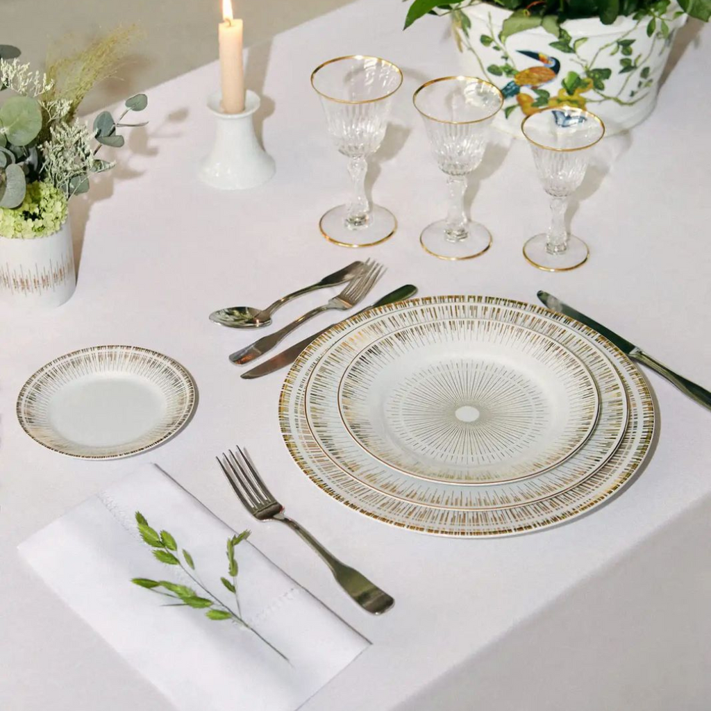 Aparelho de Jantar So com bordas douradas trás uma mesa posta elegante e decorativa para qualquer refeição.