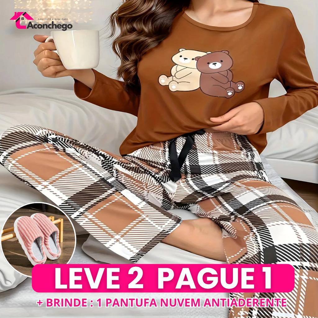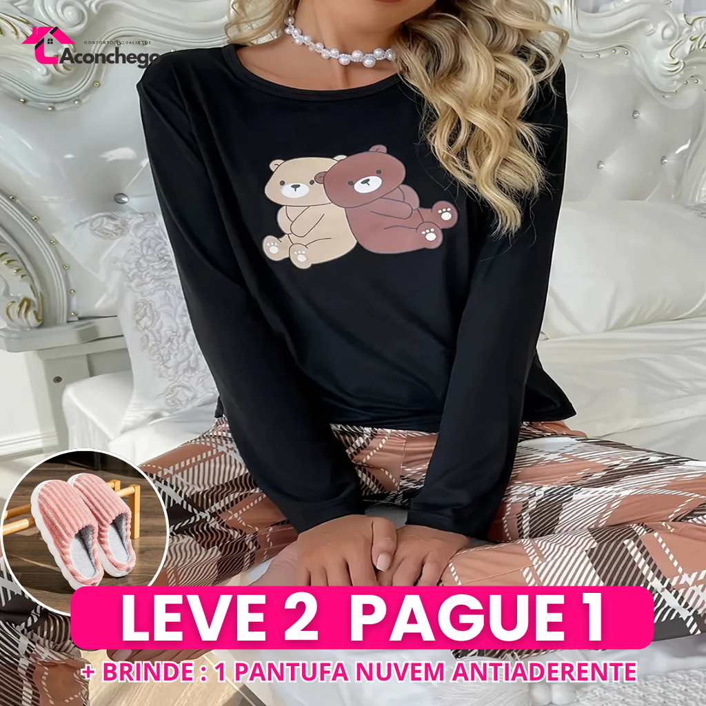 Leve 2 Pague 1] Pijama Feminino Ursinho do Inverno (Proteção e conforto térmico) + BRINDE: 1 Pantufa Antifrío + estilo para usar em casa